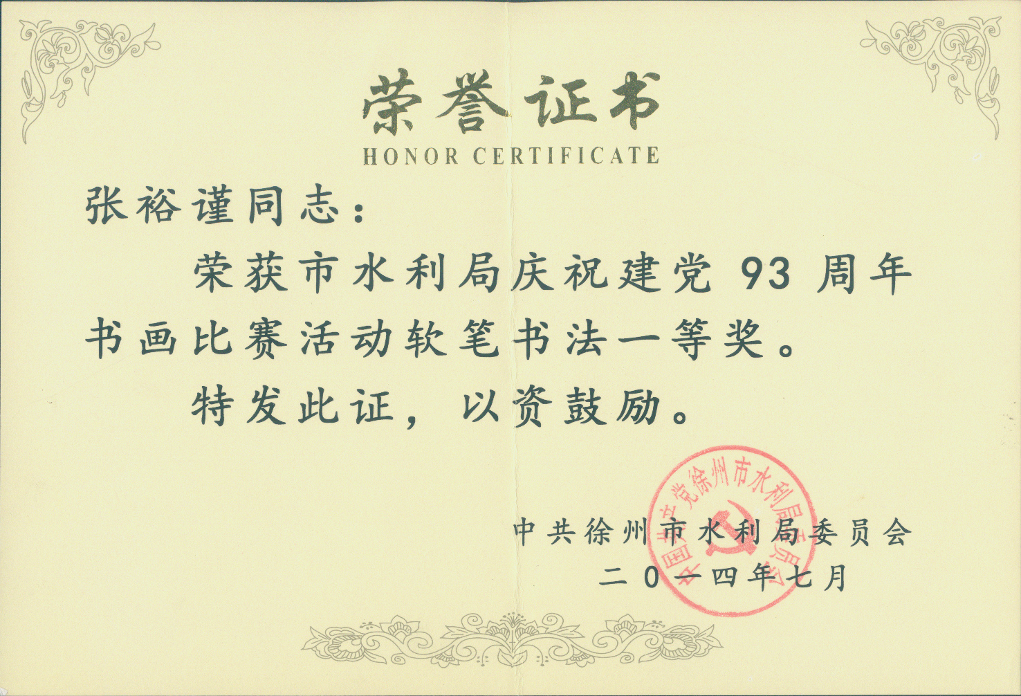 近日,市水利局舉辦慶祝建黨93周年書畫比賽活動。本次書畫比賽以“學(xué)黨史、知黨情、跟黨走”為宗旨,以“濃墨書華誕,丹青繪七一”為主題,緊密圍繞建黨93周年,緊扣時代主旋律,踐行黨的群眾路線,以書畫形式思黨恩、頌黨情、贊黨績,謳歌黨的豐功偉績,加強(qiáng)了水利局書畫愛好者之間的交流溝通。本次書畫比賽共收到到毛筆書法、硬筆書法、國畫、工筆畫等作品30余幅并進(jìn)行集中展出,參賽作品主題鮮明,內(nèi)容豐富,充分反映了水利系統(tǒng)干部職工熱愛黨、熱愛祖國、熱愛社會主義,創(chuàng)先爭優(yōu)的良好精神風(fēng)貌。經(jīng)組委會最終評定,我院職工張裕謹(jǐn)最終獲得軟筆書法、繪畫一等獎。