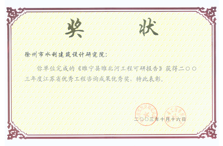 《睢北河工程可研報(bào)告》咨詢優(yōu)秀獎(jiǎng)(2003)